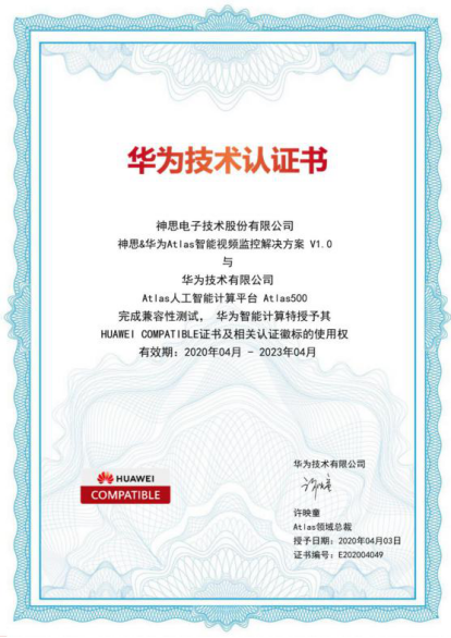 4月3日,神思電子智能視頻監(jiān)控方案順利完成華為技術(shù)有限公司Atlas人工智能計算平臺Atlas500兼容性測試,獲得了HUAWEI COMPATIBLE證書及相關(guān)認證徽標的使用權(quán),標志著神思電子正式加入華為昇騰生態(tài),未來雙方將共同進行智能視頻監(jiān)控解決方案的推廣,為行業(yè)客戶提供技術(shù)保證。