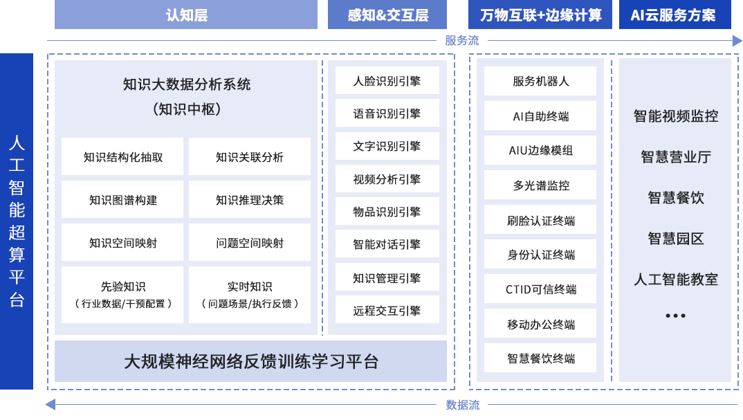 神思云腦是專業(yè)的認知計算服務平臺,服務于公司所有的AI云服務業(yè)務,包括智能視頻監(jiān)控、智慧營業(yè)廳、智慧餐飲、智慧園區(qū)、人工智能教室等。采用開放標準的技術路線,構建大規(guī)模神經(jīng)網(wǎng)絡與行業(yè)知識庫,具備語音識別、圖像識別、語義理解、知識推理、設備管理等功能,賦能政務、公安、稅務、醫(yī)療、金融、鐵路、家庭服務等行業(yè)客戶應用。通過前端應用積累用戶各類結構化與非結構化數(shù)據(jù),支持用戶知識迭代演化更新,實現(xiàn)神思云腦智力水平與服務能力的不斷提升。神思云腦動態(tài)演化機制將使AI云服務產(chǎn)品及技術持續(xù)更新,為用戶提供連續(xù)不斷的增值服務。
