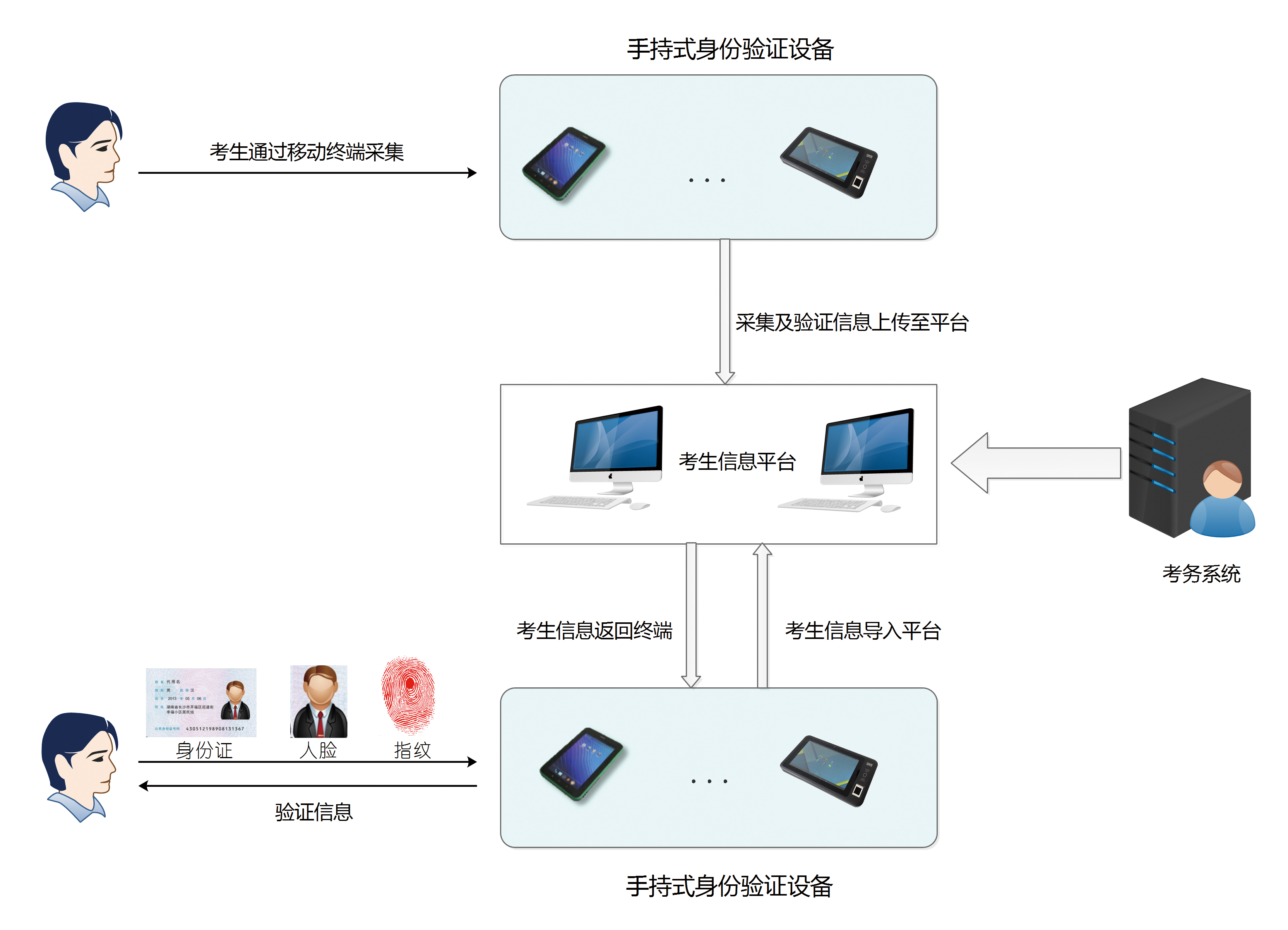 采集終端+移動(dòng)核驗(yàn)終端+考務(wù)綜合管理平臺(tái)。